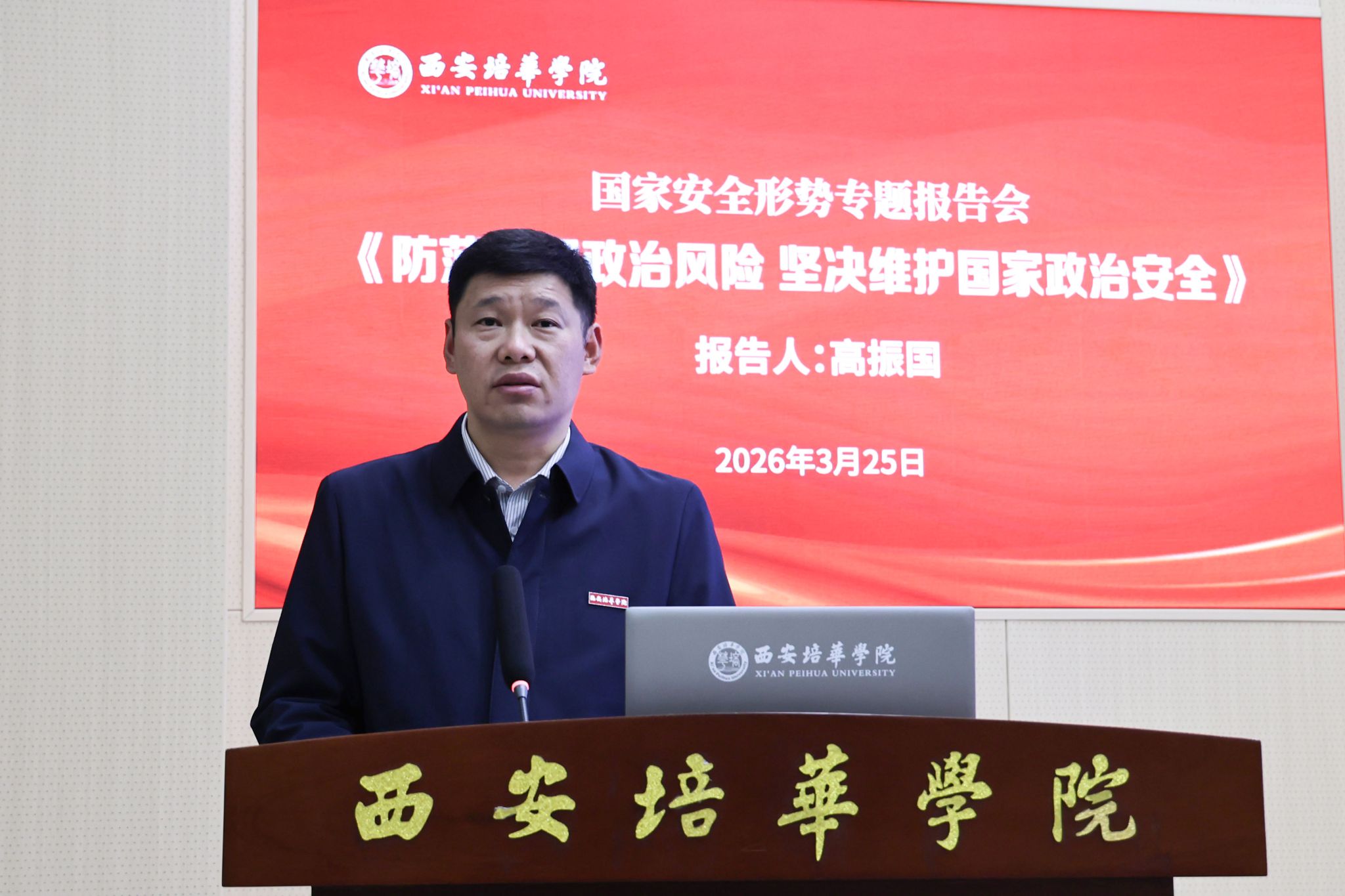 为深入贯彻落实总体国家安全观,切实提升师生国家安全意识与防范能力。3月25日下午,西安培华学院在明德楼学术报告厅举办“防范化解政治风险,坚决维护国家政治安全”主题报告会。学校全体在家校领导、二级学院院长、党委书记、职能部门负责人,教职工代表等200余人参加报告会。报告会由党委副书记蔡亮主持。