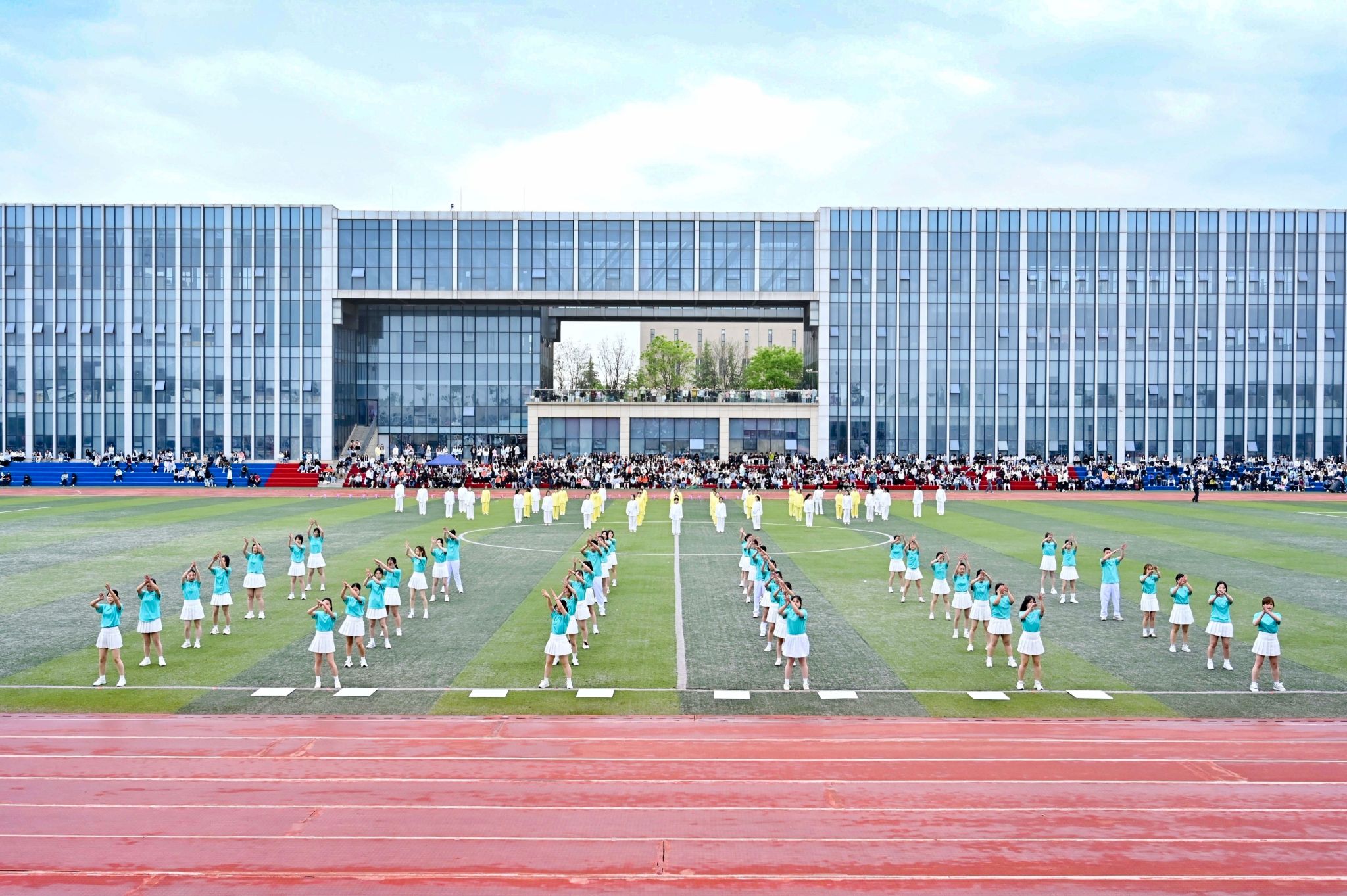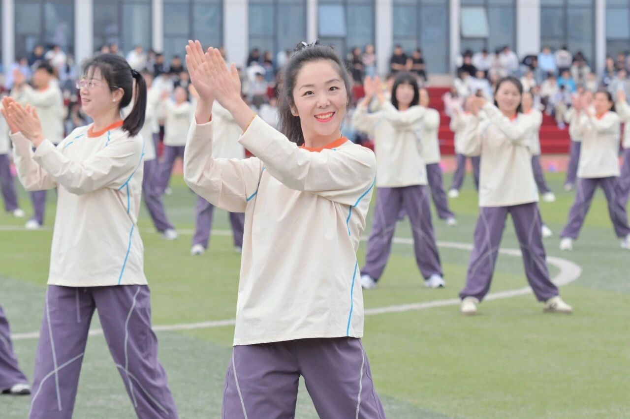 入场式视觉盛宴后,方阵表演将气氛推向顶点——老师们以《让我们一起出发》团队协作默契满分,欢笑汗水交织拉开最燃序幕;医学院《医韵青春,律动健康》动作如手术刀精准,医者仁心与青春活力完美交融;法学院《光亮》扇子开合似法典翻卷,舞步起落如正义天平,法治信仰随扇舞流淌;智工院队形变换如精密算法,智慧与汗水共振;国际教育学院《赤子风华,奔向寰宇》多元文化交融,世界眼光绽放;传媒与设计学院《横山腰鼓》以鼓为媒、以舞为翼,黄土地热情燃爆全场;文学院《礼乐华章》折扇开合如史册翻卷,舞步起落似山河泼墨,书写最美青春华章;会计与金融学院《盛世欢歌》以欢歌笑语献上盛世盛宴;体育学院《龙狮舞动,同心筑梦》舞龙舞狮踏浪掀高潮,动感节拍点燃全场,将开幕式推向最高潮。