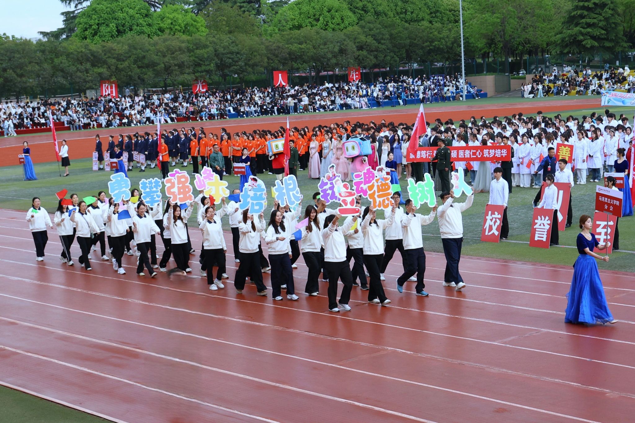智能科学与工程学院以“智行天下,能创未来”为旗,严谨与朝气并存,智慧与汗水碰撞;国际教育学院踏着青春节拍走来,融通中外,教育未来,赛场书写拼搏篇章;医学院学子白大褂作“战袍”,步伐铿锵、眼神坚定,将“医者仁心”使命带上绿茵场;法学院研习法理、秉持理性,用拼搏诠释热爱;传媒与设计学院以横山腰鼓为媒,《横山腰鼓》表演敲响时代强音,镜头捕捉青春,创意点亮赛场;会计与金融学院汇聚国奖、竞赛、实践优秀学子,精神昂扬紧随“强本申硕”步伐;文学院奖学金学子儒雅大气,以笔墨为翼、书香为魂,步履铿锵展青春榜样;体育学院七大运动专项学子龙狮舞动,《龙狮舞动,同心筑梦》将开幕式推向高潮,“强国有我”信念刻进骨血;女子学院“自尊、自信、自立、自强”,铿锵玫瑰璀璨绽放;培华职业高中师生同心,学子朝气蓬勃,教师言传身教,共展奋进风貌。