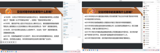黄蓉老师以线上讨论的形式,在“量变质变规律”内容中融入培华校史。通过给学生讲述培华发展经历的四个阶段,和办学过程中面临的挫折和困难,帮助学生更好理解质量互变规律,增强学生的爱校荣校情怀。