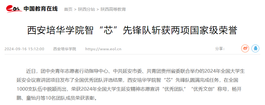近日,团中央青年志愿者行动指导中心、中共延安市委、共青团贵州省委联合举办的2024年全国大学生延安会议宣讲团项目发布了全国优秀团队评选结果,西安培华学院智“芯”先锋队圆满完成任务,在全国1000支队伍中脱颖而出,荣获2024年全国大学生延安精神志愿宣讲“优秀团队”“优秀文创”称号,杨开鹏、童怡月等10名团队成员荣获表彰。