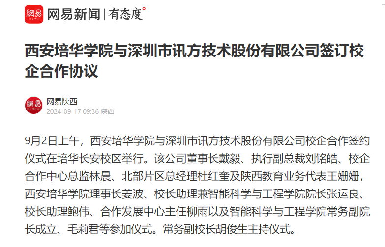 9月2日上午,西安培华学院与深圳市讯方技术股份有限公司校企合作签约仪式在培华长安校区举行。该公司董事长戴毅、执行副总裁刘铭皓、校企合作中心总监林晨、北部片区总经理杜红奎及陕西教育业务代表王姗姗,西安培华学院理事长姜波、校长助理兼智能科学与工程学院院长张运良、校长助理鲍伟、合作发展中心主任柳雨以及智能科学与工程学院常务副院长成立、毛莉君等参加仪式。常务副校长胡俊生主持仪式。