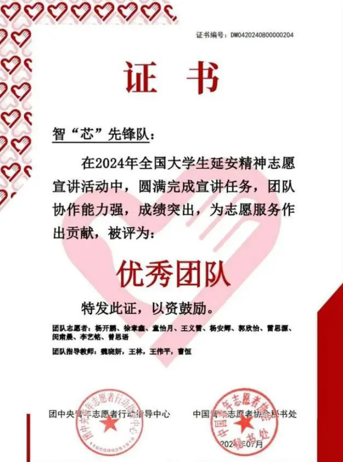 近日,团中央青年志愿者行动指导中心、中共延安市委、共青团贵州省委联合举办的2024年全国大学生延安会议宣讲团项目发布了全国优秀团队评选结果,西安培华学院智“芯”先锋队圆满完成任务,在全国1000支队伍中脱颖而出,荣获2024年全国大学生延安精神志愿宣讲“优秀团队”“优秀文创”称号,杨开鹏、童怡月等10名团队成员荣获表彰。