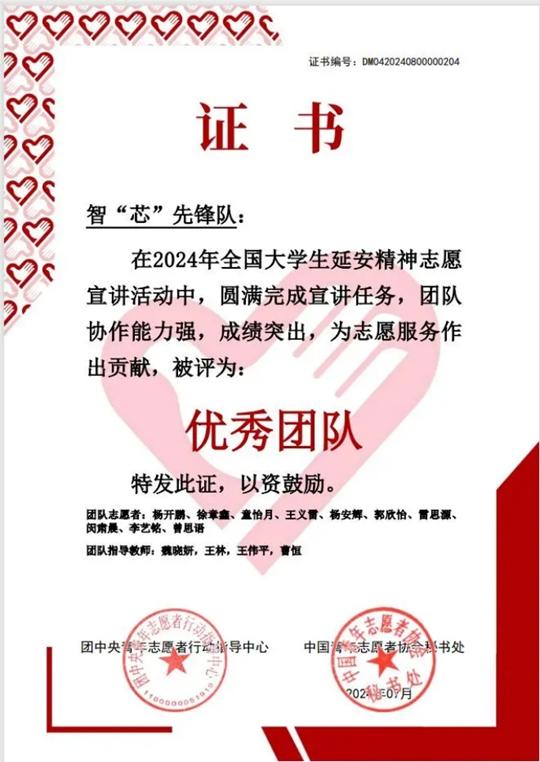 近日,团中央青年志愿者行动指导中心、中共延安市委、共青团贵州省委联合举办的2024年全国大学生延安会议宣讲团项目发布了全国优秀团队评选结果,西安培华学院智“芯”先锋队圆满完成任务,在全国1000支队伍中脱颖而出,荣获2024年全国大学生延安精神志愿宣讲“优秀团队”“优秀文创”称号,杨开鹏、童怡月等10名团队成员荣获表彰。