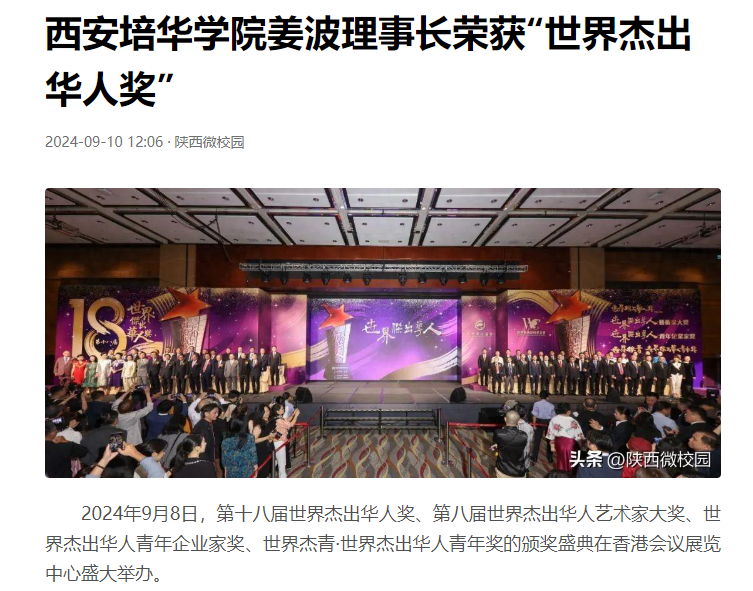 在本届颁奖典礼上,西安培华学院理事长姜波博士获颁“世界杰出华人奖”。与姜波理事长一同获奖的社会知名人士还有:西湖大学校长施一公院士、香港科技大学校长叶玉如院士、福耀玻璃工业集团董事长曹德旺先生、著名导演张艺谋先生、著名导演及演员张国立先生、香港知名导演及演员甄子丹先生、前中国电力国际有限公司董事长李小琳女士、阳光媒体集团董事长杨澜女士、首届香港电影金像奖最佳女主角惠英红女士、希捷科技原全球高级副总裁兼中国区总裁孙丹女士等。