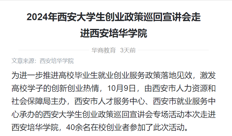 为进一步推进高校毕业生就业创业服务政策落地见效,激发高校学子的创新创业热情,10月9日,由西安市人力资源和社会保障局主办,西安市人才服务中心、西安市就业服务中心承办的西安大学生创业政策巡回宣讲会专场活动本次走进西安培华学院,40余名在校创业者参加了此次活动。