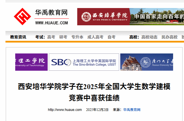 近日,陕西省教育厅发布《关于公布2025年全国大学生数学建模竞赛陕西赛区获奖名单》(陕教高办〔2025〕30号),西安培华学院学子在本次竞赛中取得优异成绩,共21支参赛队获奖,其中获得国家二等奖4项,省一等奖7项,省二等奖10项,西安培华学院被评为优秀组织先进单位。
