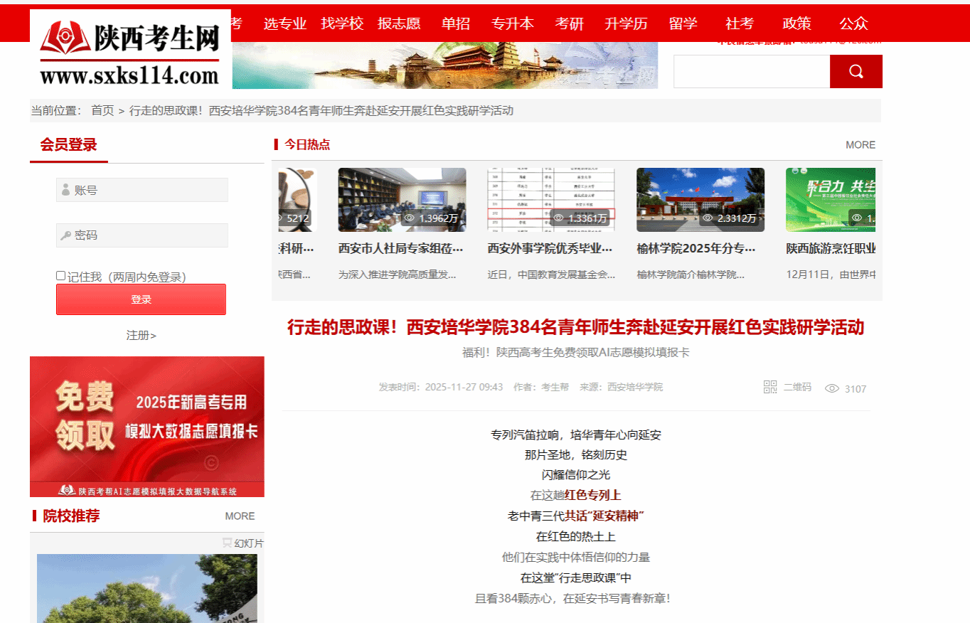 为认真贯彻落实习近平总书记关于教育的重要论述和来陕考察重要讲话及指示精神,坚持用延安精神教书育人,11月22日-23日,西安培华学院响应“到延安去・三秦学子圣地行”号召,组织384名青年师生搭乘红色专列奔赴革命圣地延安,以“行走的思政课”为载体开展为期两天的沉浸式红色实践研学活动。