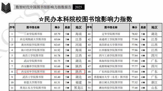 近日,武汉大学中国科学评价研究中心、数字出版智能服务技术教育部工程研究中心正式发布了《数智时代中国图书馆影响力指数报告(2025)》。西安培华学院维之图书馆位列全国民办本科院校5★级图书馆影响力指数前八强。