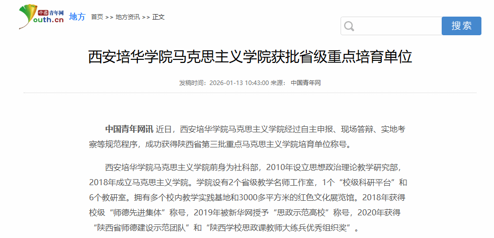 中国青年网讯 近日,西安培华学院马克思主义学院经过自主申报、现场答辩、实地考察等规范程序,成功获得陕西省第三批重点马克思主义学院培育单位称号。
