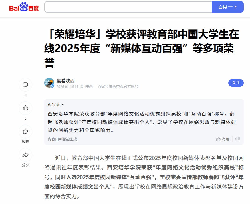 学校入选2025年度校园新媒体“互动百强”,薛超飞获评“年度校园新媒体成绩突出个人”