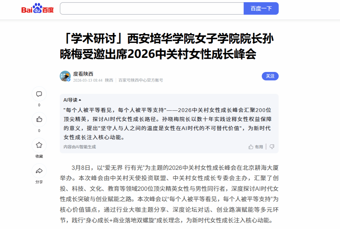 作为国内女性教育的重要阵地,西安培华学院女子学院将始终以推动女性全面发展为己任,在女性人才培养、女性学研究、妇女儿童权益保障等方面持续发力,加强与国内外女性发展领域的交流合作,将峰会中的先进理念与优质资源融入人才培养与科研实践,为更多女性的成长与发展赋能,助力新时代女性在各自的赛道上绽放独特光芒。