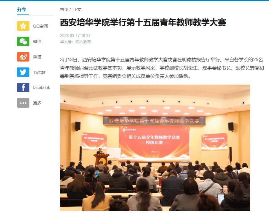 3月13日,西安培华学院第十五届青年教师教学大赛决赛在明德楼报告厅举行。来自各学院的25名青年教师同台比试教学基本功,展示教学风采,学校副校长胡俊生,理事会秘书长、副校长姜瀛初等到赛场指导工作,竞赛组委会相关成员单位负责人参加活动。