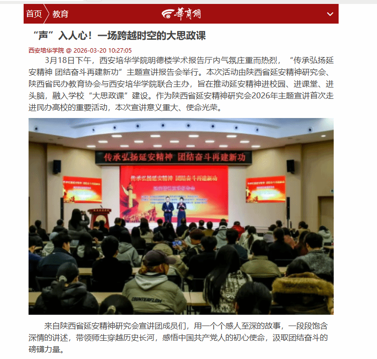 此次宣讲报告会,既是一次深刻的红色教育,也是一场有力的思想动员。西安培华学院将以此次活动为契机,把延安精神深度融入“大思政课”建设全过程,丰富育人载体、创新教学形式、强化实践引领,持续推动延安精神进校园、进课堂、进头脑,引导全体师生从延安精神中汲取信仰力量、筑牢初心使命,切实把学习成果转化为担当作为、实干笃行的强大动力,在新时代新征程上团结奋斗、再建新功。