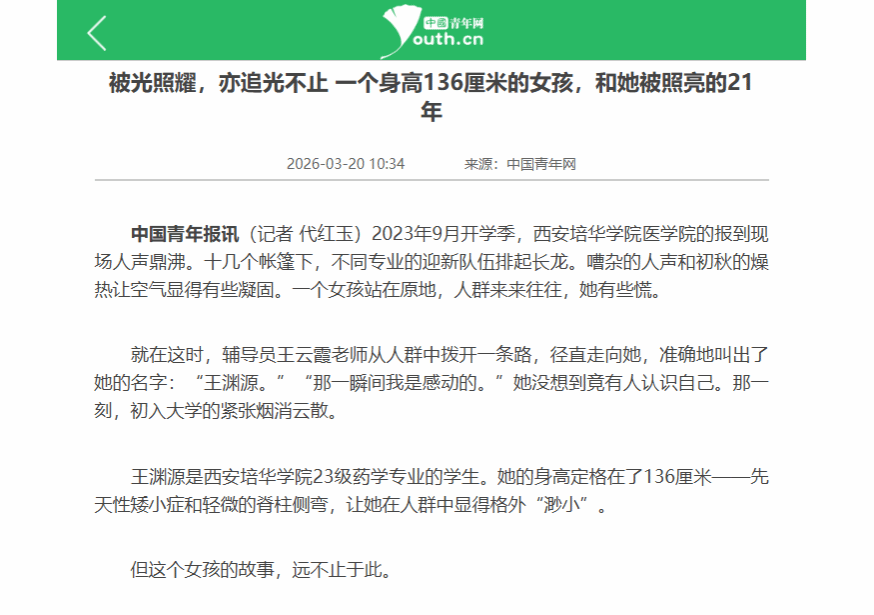 王渊源是西安培华学院23级药学专业的学生。她的身高定格在了136厘米——先天性矮小症和轻微的脊柱侧弯,让她在人群中显得格外“渺小”。