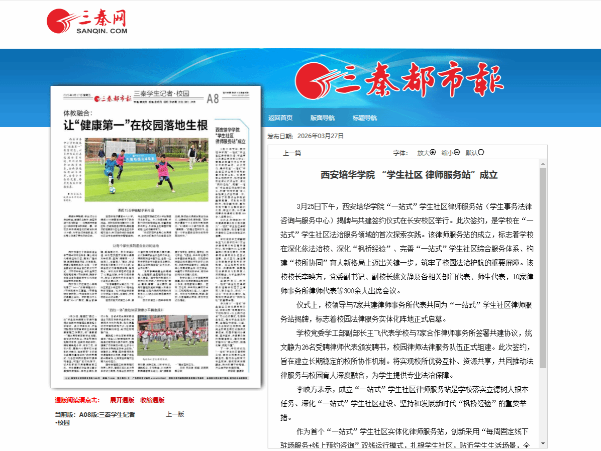 3月25日下午,西安培华学院“一站式”学生社区律师服务站(学生事务法律咨询与服务中心)揭牌与共建签约仪式在长安校区举行。此次签约,是学校在“一站式”学生社区法治服务领域的首次探索实践。该律师服务站的成立,标志着学校在深化依法治校、深化“枫桥经验”、完善“一站式”学生社区综合服务体系、构建“校所协同”育人新格局上迈出关键一步,筑牢了校园法治护航的重要屏障。该校校长李映方,党委副书记、副校长姚文静及各相关部门代表、师生代表,10家律师事务所律师代表等300余人出席会议。