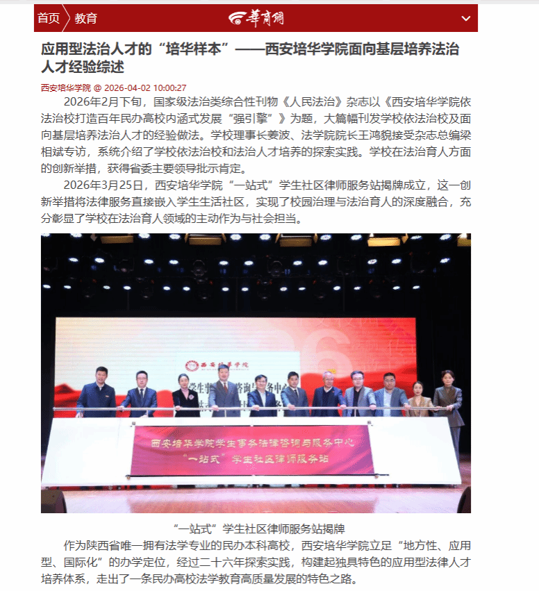 2026年3月25日,西安培华学院“一站式”学生社区律师服务站揭牌成立,这一创新举措将法律服务直接嵌入学生生活社区,实现了校园治理与法治育人的深度融合,充分彰显了学校在法治育人领域的主动作为与社会担当。