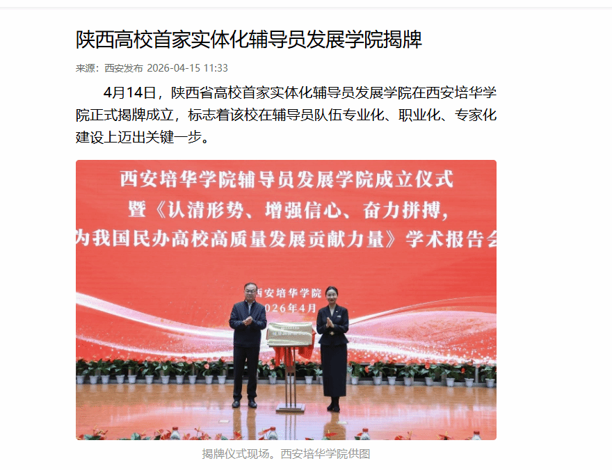 西安培华学院辅导员发展学院,是陕西高校中首个实体化运行的辅导员专职培养机构。学院深入贯彻落实《全面加强新时代高校辅导员队伍建设行动方案》精神,是学校着力建强新时代高校思想政治工作“第四支队伍”的标志性实践举措。学院下设辅导员发展研究中心、辅导员培训与培养中心、辅导员实践创新中心,聚焦“新苗—成长—骨干—专家”分层分类培养,模块化精品课程体系构建、辅导员工作室与特色项目孵化、科研赋能与实践创新融合四大核心任务系统发力。(作者:苏成君)