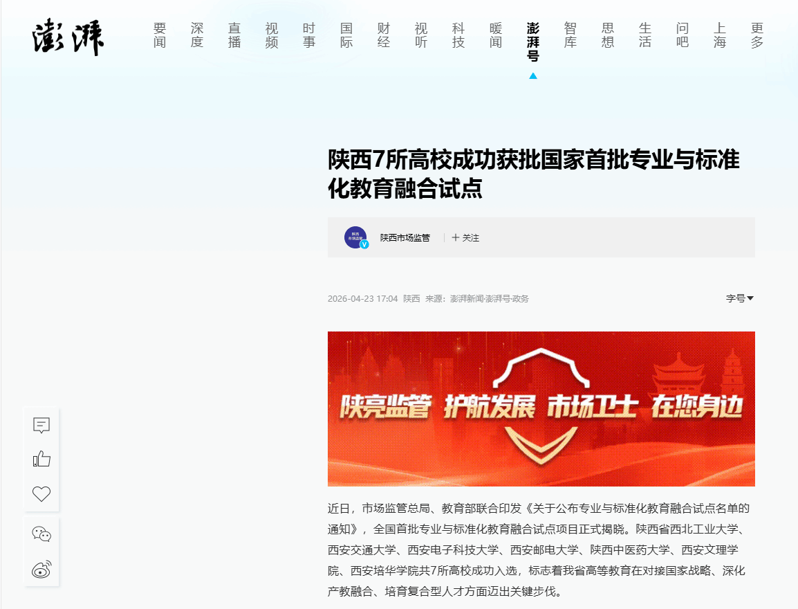 近日,市场监管总局、教育部联合印发《关于公布专业与标准化教育融合试点名单的通知》,全国首批专业与标准化教育融合试点项目正式揭晓。陕西省西北工业大学、西安交通大学、西安电子科技大学、西安邮电大学、陕西中医药大学、西安文理学院、西安培华学院共7所高校成功入选,标志着我省高等教育在对接国家战略、深化产教融合、培育复合型人才方面迈出关键步伐。