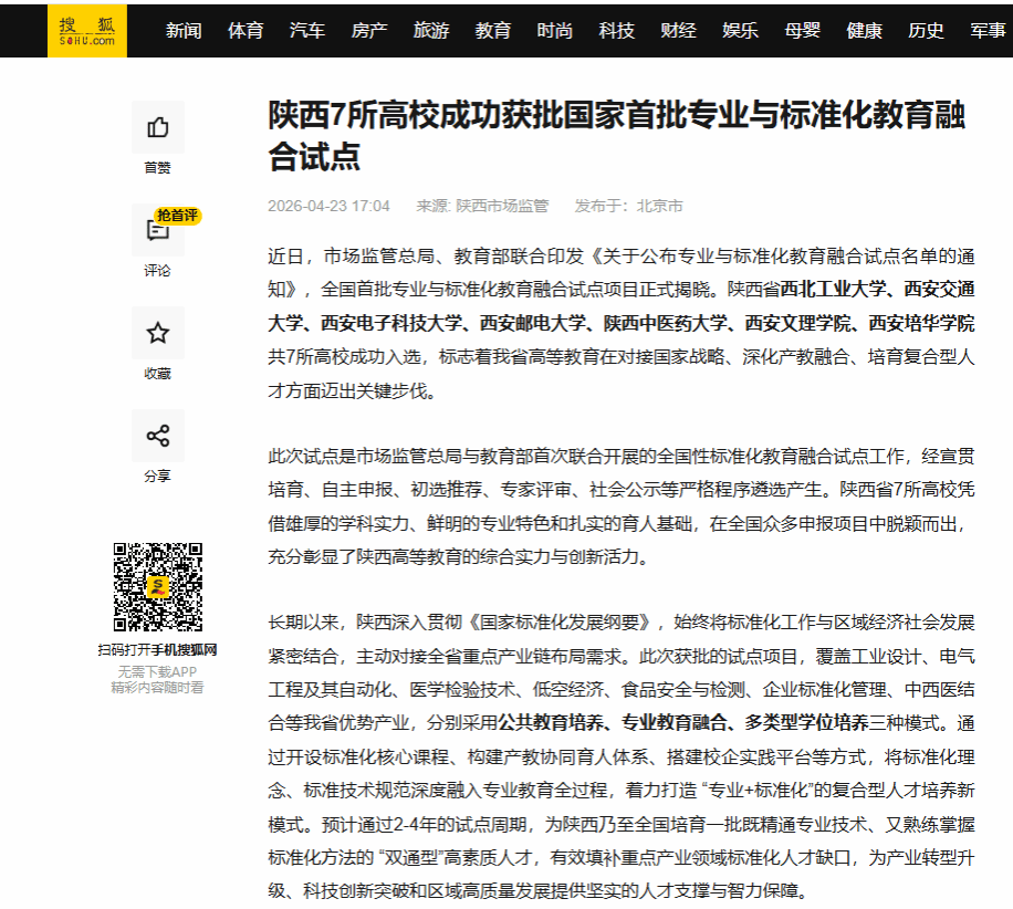 近日,市场监管总局、教育部联合印发《关于公布专业与标准化教育融合试点名单的通知》,全国首批专业与标准化教育融合试点项目正式揭晓。陕西省西北工业大学、西安交通大学、西安电子科技大学、西安邮电大学、陕西中医药大学、西安文理学院、西安培华学院共7所高校成功入选,标志着我省高等教育在对接国家战略、深化产教融合、培育复合型人才方面迈出关键步伐。