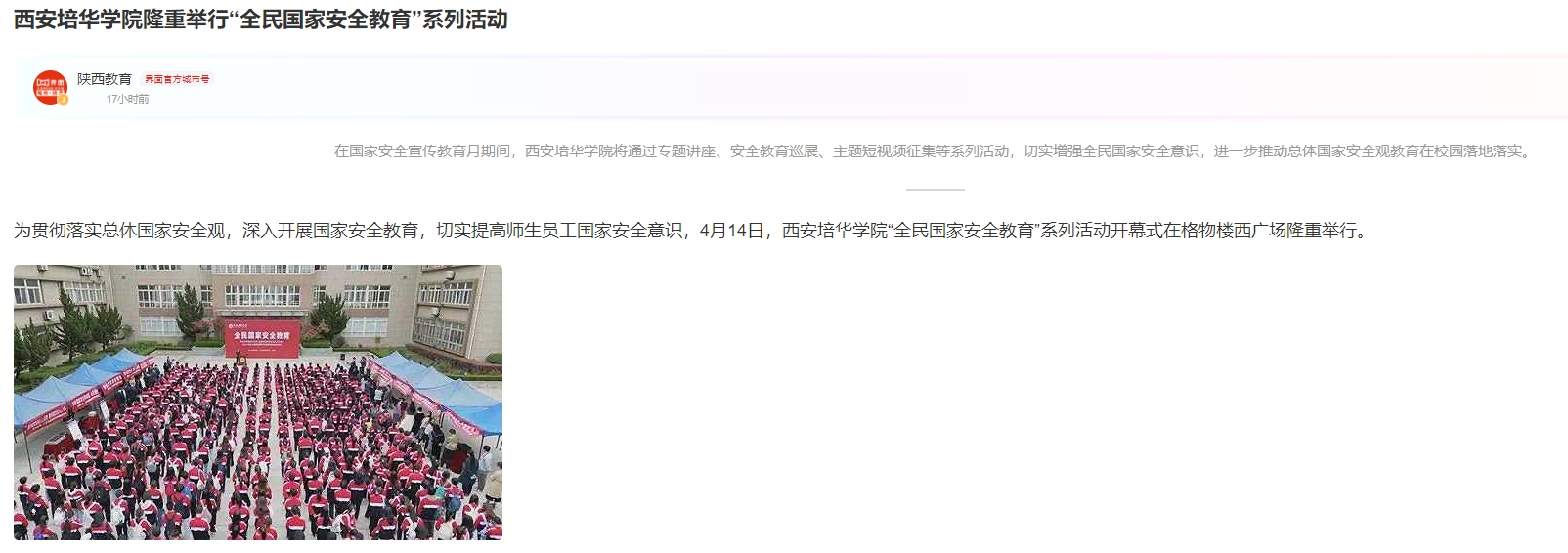 在国家安全宣传教育月期间,西安培华学院将通过专题讲座、安全教育巡展、主题短视频征集等系列活动,切实增强全民国家安全意识,进一步推动总体国家安全观教育在校园落地落实。