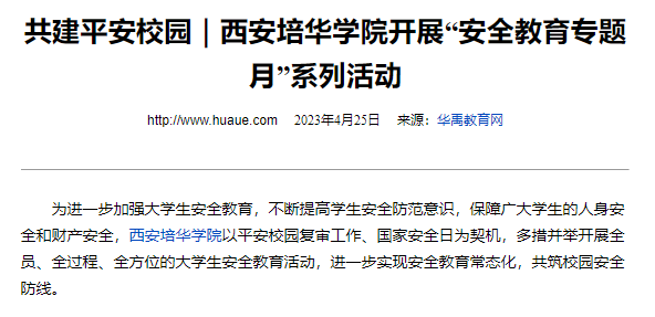为进一步加强大学生安全教育,不断提高学生安全防范意识,保障广大学生的人身安全和财产安全,西安培华学院以平安校园复审工作、国家安全日为契机,多措并举开展全员、全过程、全方位的大学生安全教育活动,进一步实现安全教育常态化,共筑校园安全防线。