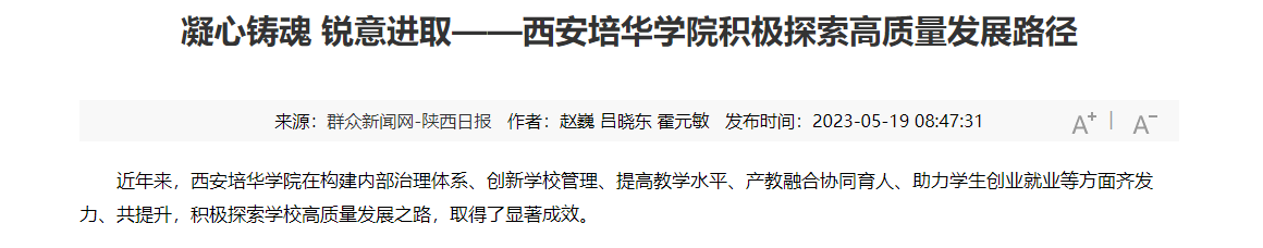 近年来,西安培华学院在构建内部治理体系、创新学校管理、提高教学水平、产教融合协同育人、助力学生创业就业等方面齐发力、共提升,积极探索学校高质量发展之路,取得了显著成效。