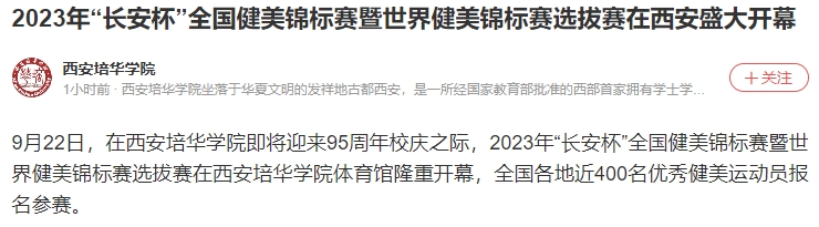 9月22日,在西安培华学院即将迎来95周年校庆之际,2023年“长安杯”全国健美锦标赛暨世界健美锦标赛选拔赛在西安培华学院体育馆隆重开幕,全国各地近400名优秀健美运动员报名参赛。
