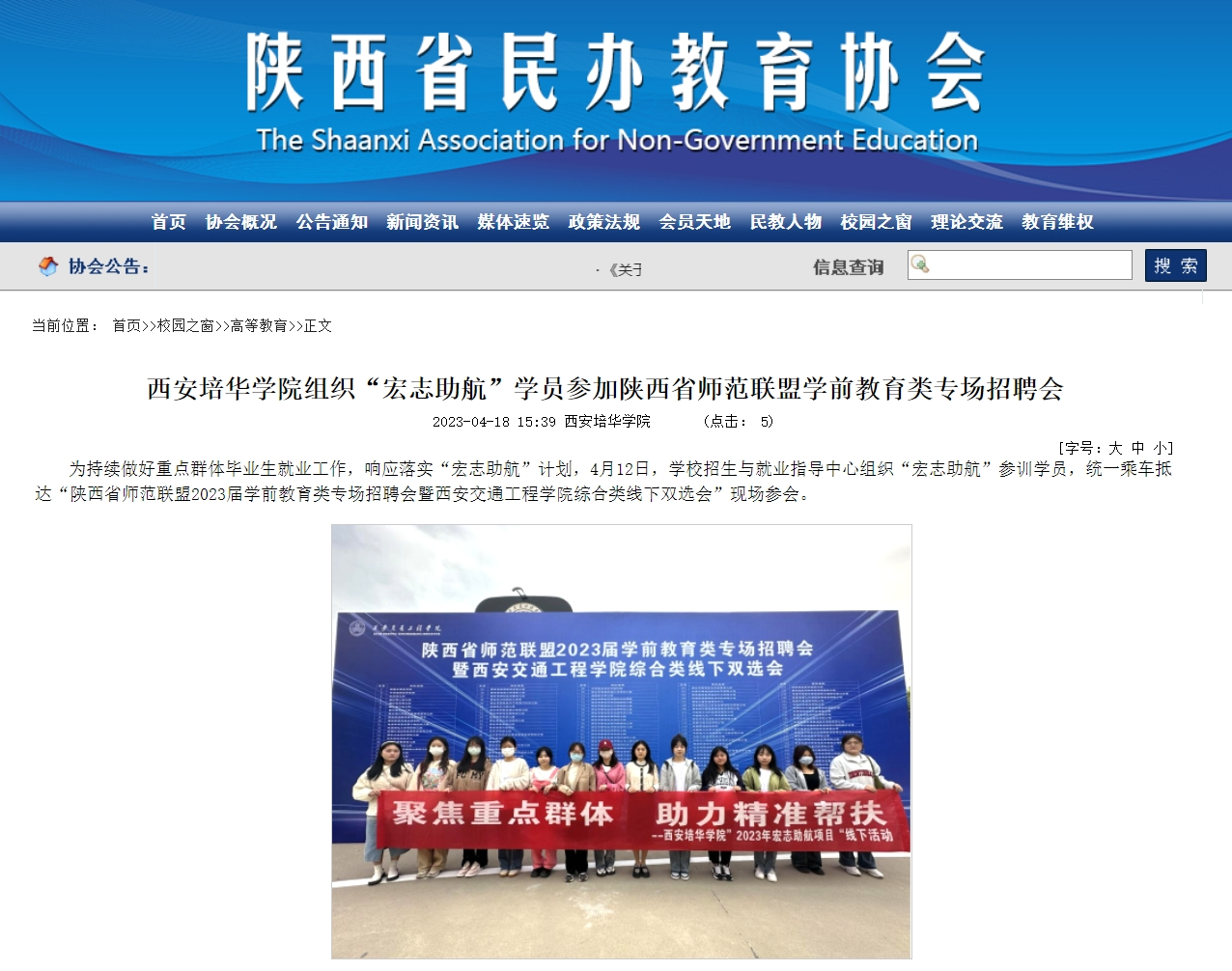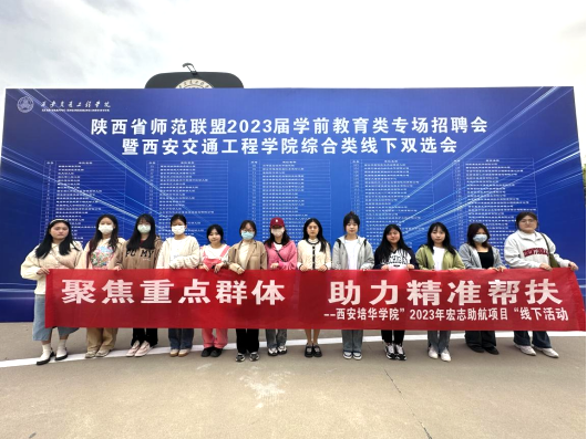 为持续做好重点群体毕业生就业工作,响应落实“宏志助航”计划,4月12日,学校招生与就业指导中心组织“宏志助航”参训学员,统一乘车抵达“陕西省师范联盟2023届学前教育类专场招聘会暨西安交通工程学院综合类线下双选会”现场参会。