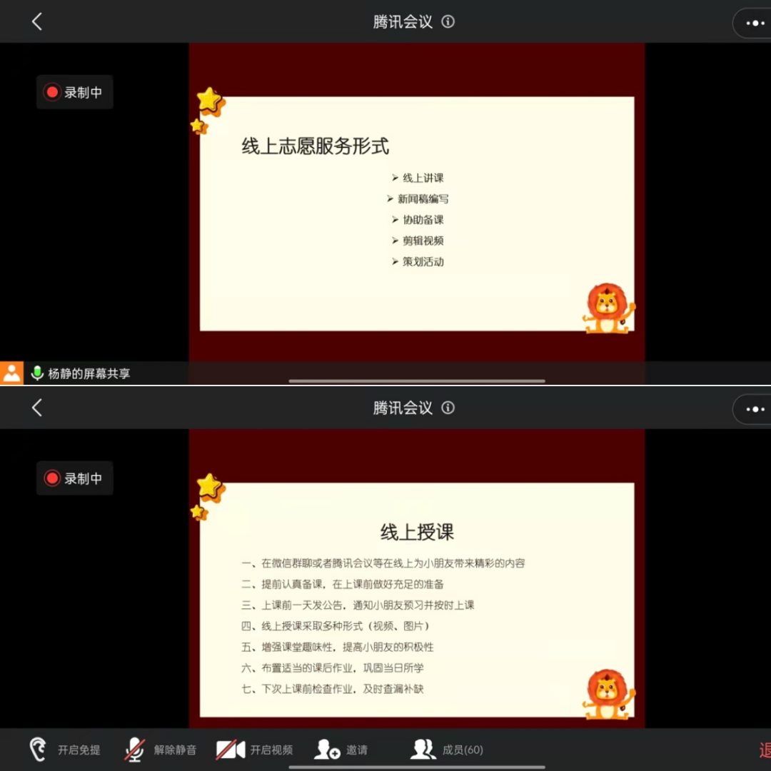 闵怡静同学解答了志愿者们对于线上授课的疑惑,详细的讲解了线上志愿服务形式,同时分享了线上授课技能,以及寒假线上授课安排,帮助志愿者们在后面的服务活动中,做好前中后期工作,建立完整的志愿服务管理体系。
