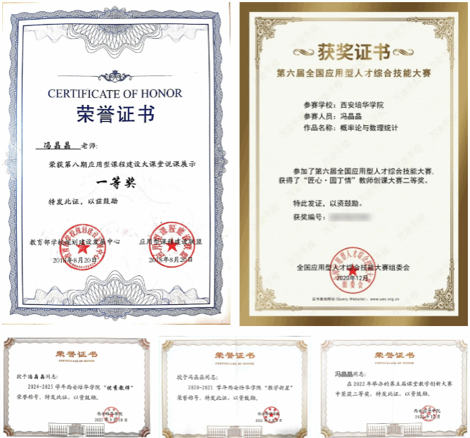 这些创新实践为她赢得诸多荣誉:教育部学校规划建设发展中心应用型课程建设大课堂说课大赛国家一等奖、陕西省大学数学教学创新大赛一等奖、全国应用型人才技能教师创课大赛二等奖、校级应用型多媒体课件一等奖、教案一等奖,第五届课堂创新大赛校级二等奖等多项荣誉,同时荣获校级“教学新星”称号以及“优秀教师”称号。
