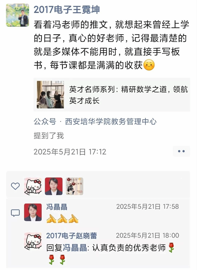 针对学习困难的学生,冯晶晶建立了专门的帮扶档案,定期与学生谈心交流,分享高效学习方法,还鼓励他们尝试成为“小老师”。当学生通过自己的努力向同伴讲清知识点时,那份被点燃的自信与成就感,成为他们主动成长的强大动力。这份用心,让毕业多年的学生仍念念不忘——2017级电子专业的王霓坤在朋友圈转发冯晶晶的推文时写道:“真心的好老师,记得最清楚的就是手写板书,每节课都是满满的收获。”