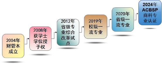 学院早在1945年培华职校时期就开设了“高级会计科”,经过长期的建设和改革,获得了社会普遍认可并享有较高社会声誉。2007年最早获得“管理学学士学位授予权”;2009年获批“省级特色专业”建设项目;2010年获批“省级重点扶持专业”建设项目;2017年获批“省级一流专业”建设项目;2020年获批“双万计划”国家级一流本科专业建设点;2023年成为ACBSP商科专业认证会员,持续推进专业认证工作。