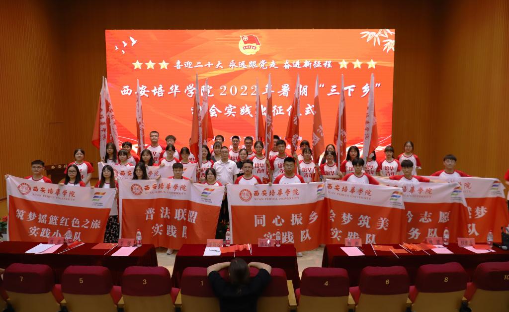 出征仪式现场展播了2021年西安培华学院社会实践“三下乡”《一路生花,青春绽放》;校团委杨媛老师宣读《关于成立西安培华学院2022年度暑期“三下乡”社会实践团队的通知》;参会嘉宾分别为2022校级重点立项团队、2022校级重点立项团队、2022校级重点立项团队授旗。
