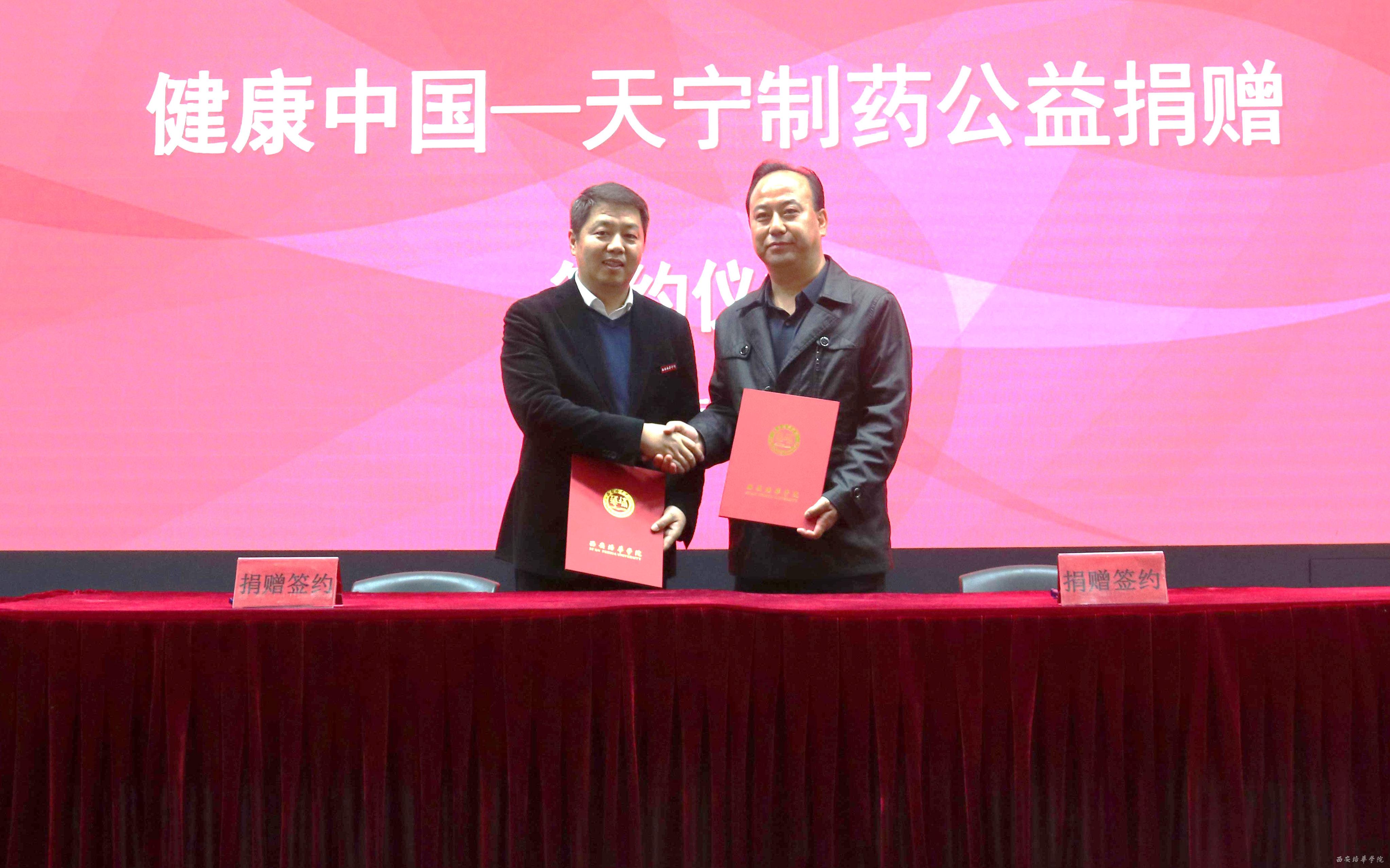 天宁制药有限责任公司营销中心总监拓兴伟与西安培华学院医院院长李旭军签署了公益捐赠协议