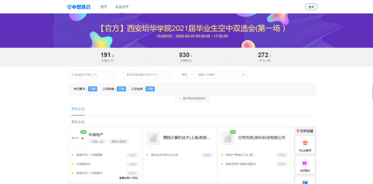此次空中双选会是我校促进2021届毕业生就业开展的首场线上招聘会,学校领导高度重视。招生与就业指导中心积极筹备,大力宣传,广发邀请函,共吸引了来自陕西、北京、天津、重庆、江苏、浙江、广东、甘肃、山西、辽宁、山东、四川、贵州等全国17个省(直辖市)170家优质单位参与招聘揽才,涵盖财经类、建筑类、计算机类、传媒类、教育类、管理类、营销类、医学类等行业,提供就业岗位10017个,我校毕业生积极参会并主动与用人单位沟通,达到了预期的效果。