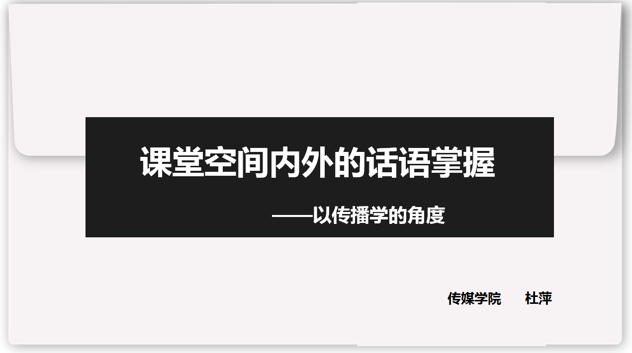 杜萍老师开场并没有直接告诉我们传播的概念是什么,而是精炼的总结出课堂空间中的传播是通过信息、符号、媒介、人和希望变化来进行人际传播和组织传播的,并告诉大家虽然传授主体信息相对不对称,交流相对不平等,但现在网络的发达、信息获取渠道的发达,在很大程度上会消解这种不平等和话语“强权”,这就是课堂空间的传授关系。影响课堂空间中传播的话语因素在课堂空间内指的是话语内容、话语形式和话语主体的调节,在课堂空间外则指的是传授关系。杜老师通过她多年的授课经验告诉我们,只要通过知识、智能、价值、态度和行为,调控掌握好包括赢效因素、受众心理、传播场和传授关系在内的课堂空间内外的话语,就能顺利实现传播效果。