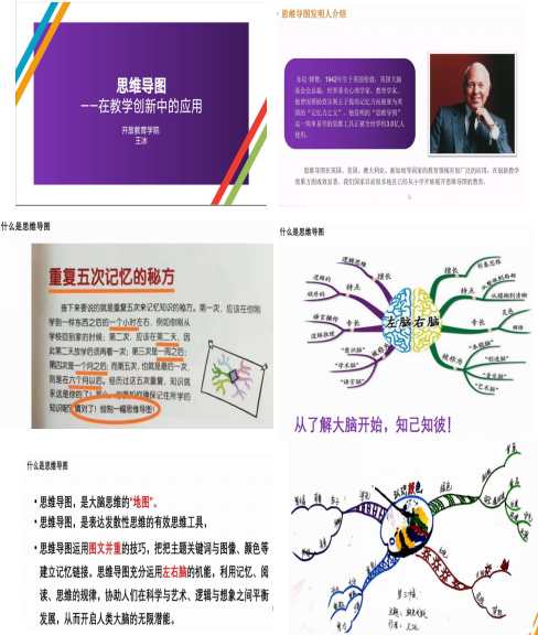紧接着,王冰老师给我们讲述了思维导图的基本概念。思维导图是由美国教授东尼博赞先生发明,继而普及应用于全球,目前在我国大部分地方学校课堂广泛应用。思维导图在大脑整理、记忆等方面也有一定的适用性。之后她展示了如何将思维导图应用到各学科的教学当中,同时提及了思维导图在其它工作、生活方面的应用。
