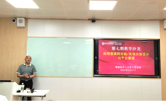为进一步提高专业建设水平,深入推进应用型课程改革,6月24日下午,由教师发展中心主办、智能科学与信息工程学院承办的第七期教学沙龙在博远楼2204如期进行,各学院教师代表共30余人参加。本次教学沙龙由智能科学与信息工程学院田孝华副院长主讲,主题为“如何设计应用型课程的实验/实训内容以及如何开发实验/实训平台。