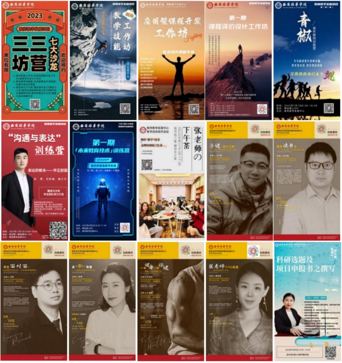 ——开展“三坊三营七大沙龙”,个性化活动引领教师成长。“三坊三营七大沙龙”系列活动是体系实施的创新,是教学咨询项目与教学培训项目的重要落实途径。“三坊”包括教学技能工作坊,应用型课程开发工作坊和课程评价设计工作坊等;“三营”包括青椒训练营,未来教育技术训练营和沟通与表达训练营;“七大沙龙”包括张老师の下午茶,子健设计工坊,课改读书会,学情分析与策略研究会,教师形象设计沙龙,健康与运动保健沙龙,职业生涯发展体验沙龙。为满足更多教师的个性化发展需要,学校继续开发实施了师说漫谈、课改杂谈、每周一读、科研成长营、开学第一课、艺术心理体验工作坊、走进博物馆、星光夜校等系列主题活动。“三坊三营七大沙龙”系列主题活动以“开放式、小规模、个性化”的特点定期或不定期开展,形式灵活、内容丰富、针对性强,在赋能教师专业发展的同时,兼顾教师个性化发展,促进教师的全面发展。活动部分宣传海报如图3所示。