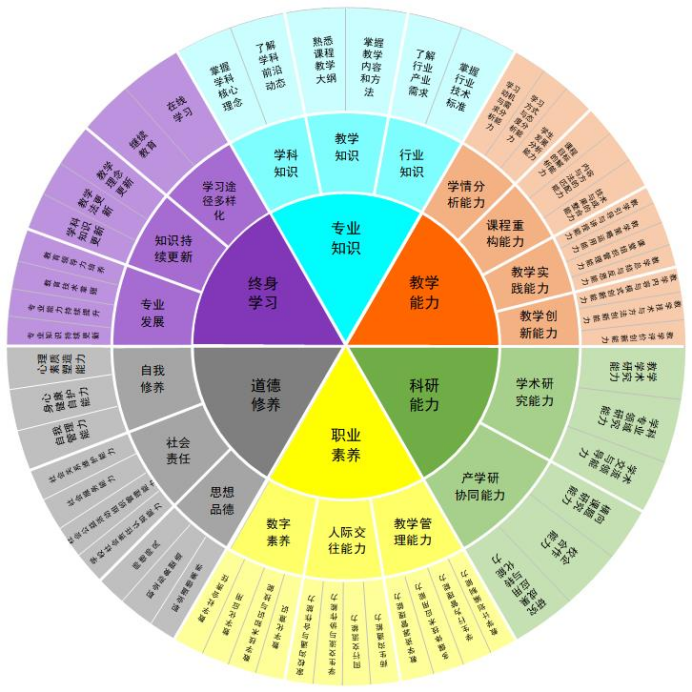 ——构建教师职业胜任力模型,精准对标职业发展新路径。学校结合社会需求与教学工作的实际情况,设计了适应于应用技术型本科高校发展的教师职业胜任力素质模型,模型主要包括专业知识、教学能力、科研能力、职业素养、道德修养、终身学习等6个一级指标,以及学科知识等18个二级指标点和56个三级指标点,并对每项指标进行具体说明,帮助教师理清并确立职业发展能力图谱。