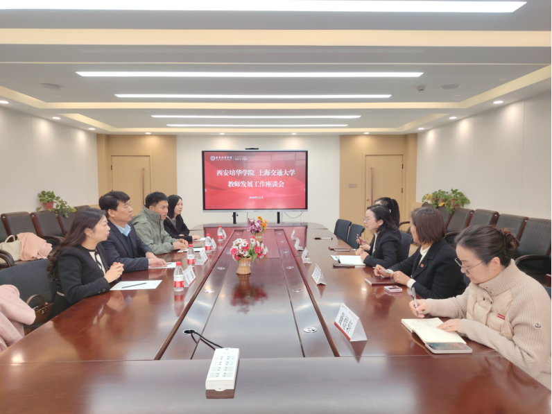 2024年12月27日上午,上海交通大学终身教育学院党支部书记、中心主任、副教授余海,干培培训创新中心项目主任甘露,终身教育学院教务老师程琳芮,以及陕西省教科文卫体工会三级调研员闫军思一行四人,莅临我校进行教学交流与合作洽谈。此次访问旨在加强两校之间的合作与交流,共同推动教师发展和教育创新。