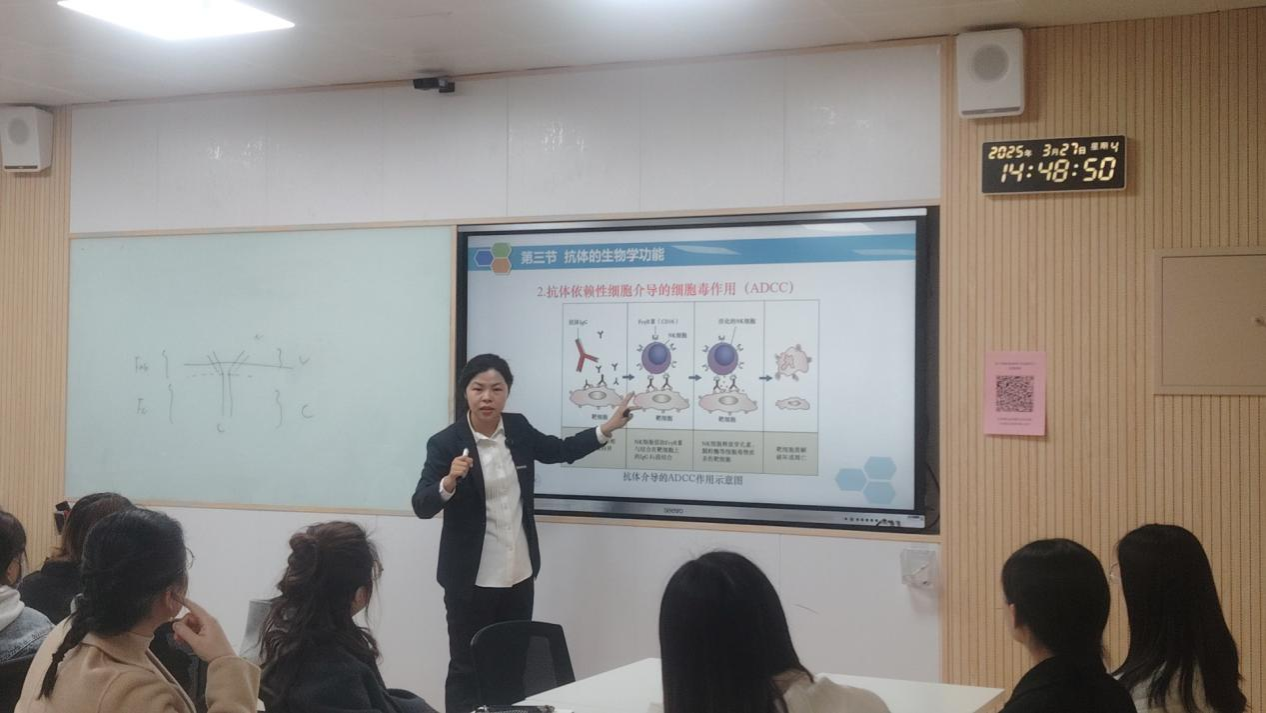 白宏老师以BOPPPS教学模型为结构,以抗体的结构和功能为主线,系统讲解了抗体的生物学特性,并通过临床案例的深入分析,生动展示了抗体在人体健康中的重要作用。在教学过程中,白老师注重师生互动,通过提问、讨论等方式引导思考,充分体现了“以学生为中心”的教学理念。