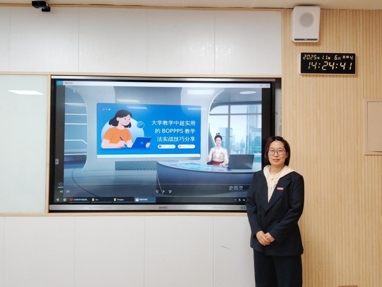 活动伊始,史雨灵老师利用自己制作的数字人,系统分享了BOPPPS教学法的实战技巧。在分享中,史老师结合大学教学实际,逐一解析导入、目标、前测、参与式学习、后测、总结六个环节的设计要点。此外,史老师还现场演示了数字人教学视频制作流程为教师们提供了信息化教学新思路。