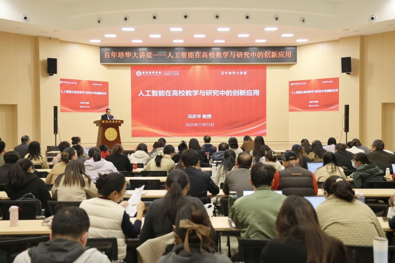 2025年11月12日,由西安培华学院科研管理中心、教师教学发展中心主办,国际教育学院承办的"培华百年大讲堂"在明德楼报告厅成功举行。本次讲座特邀上海外国语大学原副校长、资深翻译家冯庆华教授,就"人工智能在高校教学与研究中的创新应用"作专题报告。常务副校长胡俊生、国际教育学院院长梁蕊以及全校教师代表共255人参加讲座,讲座由常务副校长胡俊生主持。