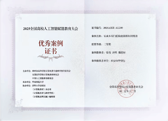 近日,2025全国高校人工智能赋能教育大会(AIEE2025)优秀案例评选结果正式揭晓,我校张伟教授团队申报的《零成本零门槛构建课程知识图谱》凭借鲜明的创新特色、扎实的实践基础和广泛的推广价值荣获二等奖。该案例的获奖不仅彰显了学校在人工智能与教育深度融合领域的探索成果,更为高校数字化教学改革提供了可复制、可推广的实践范例。