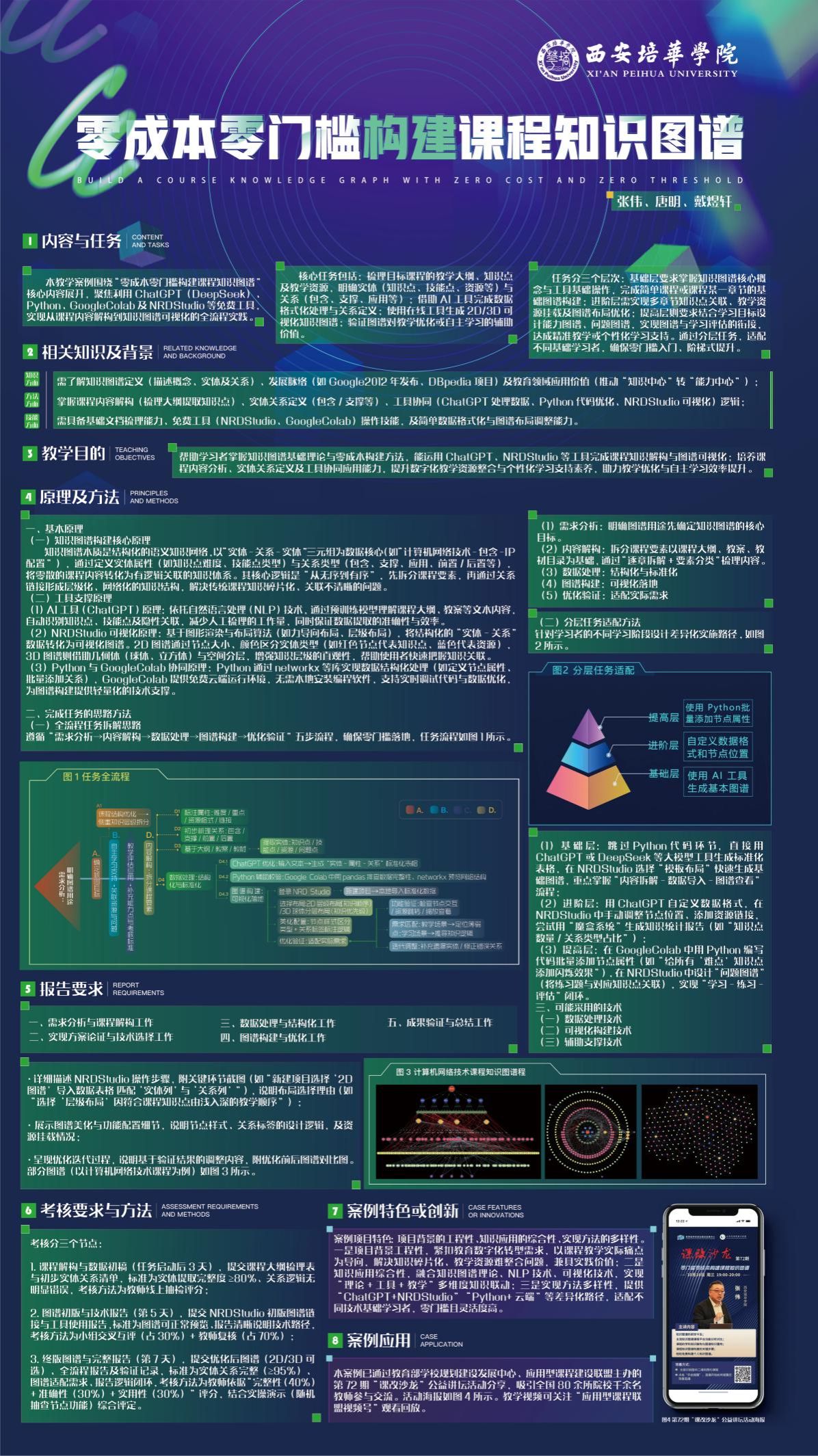 张伟老师团队的《零成本零门槛构建课程知识图谱》案例,聚焦高校教学中知识碎片化、资源整合难、个性化学习支持不足等痛点,创新性地提出利用DeepSeek、Python、GoogleColab及NRDStudio等低成本工具,构建从课程内容解构到知识图谱可视化的全流程实践方案,实现了"理论学习-工具应用-教学实践"的深度融合。