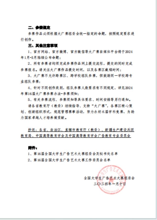 (一)选手于2024年6月5日12:00提交大广赛官网报名信息+作品图片电子版,提交企业微信-传媒与设计学院张荣花,不接受个人报送;传媒学院按专业提交,其他学院按学院提交。(电子版⽂件包⾥各层级命名⽅式:院系全名/参赛类型/命题类别/作品编号/作品、报名表、学⽣证、承诺书(签 字)。