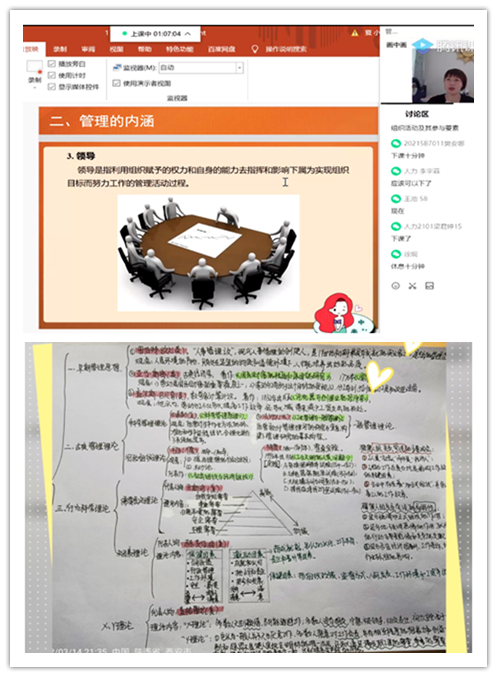 会计与金融学院夏小荣老师在进行《管理学原理》课程讲授时,引入时政案例及身边实际管理案例,注重与学生互动,讨论区交流活跃;在教法上,注重融入课程思政元素和案例分析;在学法上,注重引导学生学习方法,采用总结及思维导图的方式,帮助学生记忆所学知识。课后夏老师分享自己手写笔记,加强同学们对重难点知识的学习。