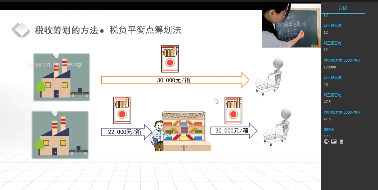 会计与金融学院白迪化老师担任《纳税筹划》课程教学。白老师在讲授税负平衡点筹划法时,针对重难点内容配备小黑板进行在线书写,帮助学生理论联系实际,深度还原课堂教学场景,带领学生逐步分析税务筹划方法及其应用,收到很好的网络课堂教学效果。